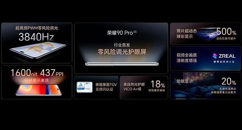 此次發(fā)布會帶來了榮耀90和榮耀90 Pro,全系首發(fā)搭載了2億像素寫真相機,以及3840Hz超高頻PWM零風(fēng)險調(diào)光功能。榮耀終端有限公司 CEO 趙明先生稱,這次的榮耀 90 系列,他們希望在影像(2 億像素寫真相機)、屏幕(3840Hz 超高頻 PWM 零風(fēng)險調(diào)光護眼屏)、續(xù)航(5000mAh 高密度超大容量電池)這三個領(lǐng)域有所突破。