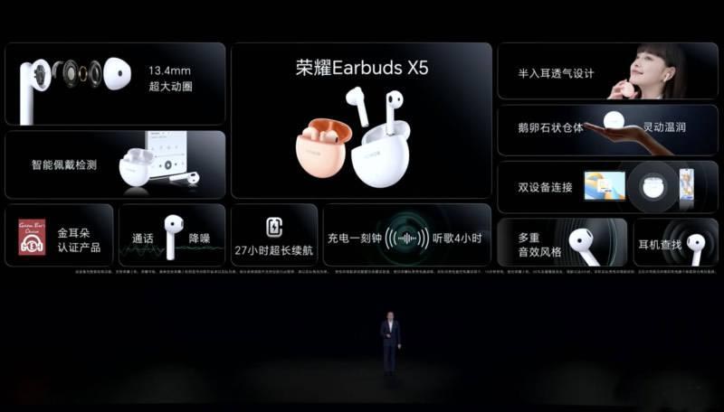 發(fā)布會上,榮耀還帶了一款Earbuds X5耳機新品,采用了鵝卵石狀倉體,提供釉白色和珊瑚粉兩款配色。耳機采用了半入耳設(shè)計,單只僅重3.8g,帶來空氣感舒適佩戴體驗。Earbuds X5采用了13.4mm動圈單元,復(fù)合鍍鈦振膜,呈現(xiàn)純正音質(zhì),并通過金耳朵產(chǎn)品認證。Earbuds X5提供了27小時超長續(xù)航,充電一刻鐘,可以支持4小時聽歌體驗。