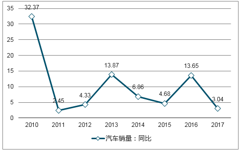 2008年-2017年汽車銷量(萬輛)及其同比變化(%)