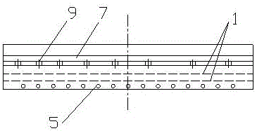 本實(shí)施例是一種不銹鋼彎頭保護(hù)氣氛熱處理導(dǎo)氣裝置,結(jié)構(gòu)如圖1-3所示,包括箱體、導(dǎo)流板以及聚氣孔,箱體由隔板4分割構(gòu)成彎管放置區(qū)1和保護(hù)氣進(jìn)氣區(qū)2,彎管放置區(qū)的空腔內(nèi)安裝測溫探頭3,保護(hù)氣進(jìn)氣區(qū)位于彎管放置區(qū)的正下方,保護(hù)氣進(jìn)氣區(qū)側(cè)面下部設(shè)有保護(hù)氣進(jìn)氣孔5,保護(hù)氣進(jìn)氣孔由多個沿箱體側(cè)面寬度方向并排設(shè)置的氣孔組成。在保護(hù)氣進(jìn)氣區(qū)內(nèi)通過導(dǎo)流板6分隔構(gòu)成往返折流的保護(hù)氣進(jìn)氣通道,保護(hù)氣進(jìn)氣通道的下端與保護(hù)氣進(jìn)氣孔相通,彎管放置區(qū)通過均勻分布在隔板上的聚氣孔9與保護(hù)氣進(jìn)氣區(qū)相通;箱體側(cè)面頂部設(shè)有放置管彎頭的開口7,保護(hù)氣進(jìn)氣孔與箱體放置管彎頭的開口設(shè)置在同側(cè),通過放置管彎頭的開口7與彎管放置區(qū)的空腔相通,彎管放置區(qū)的空腔內(nèi)支撐面上設(shè)有多根平行布置的支撐瓷管8,支撐瓷管的布置方向與鋼管彎頭的進(jìn)出方向垂直。