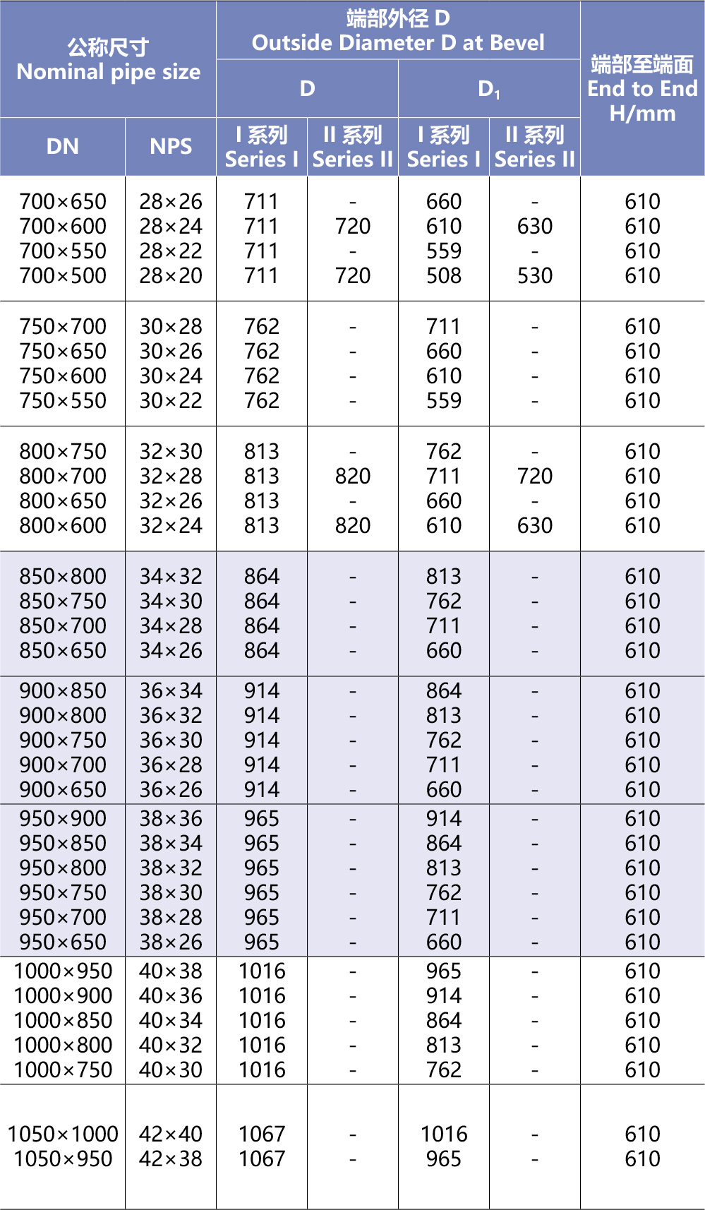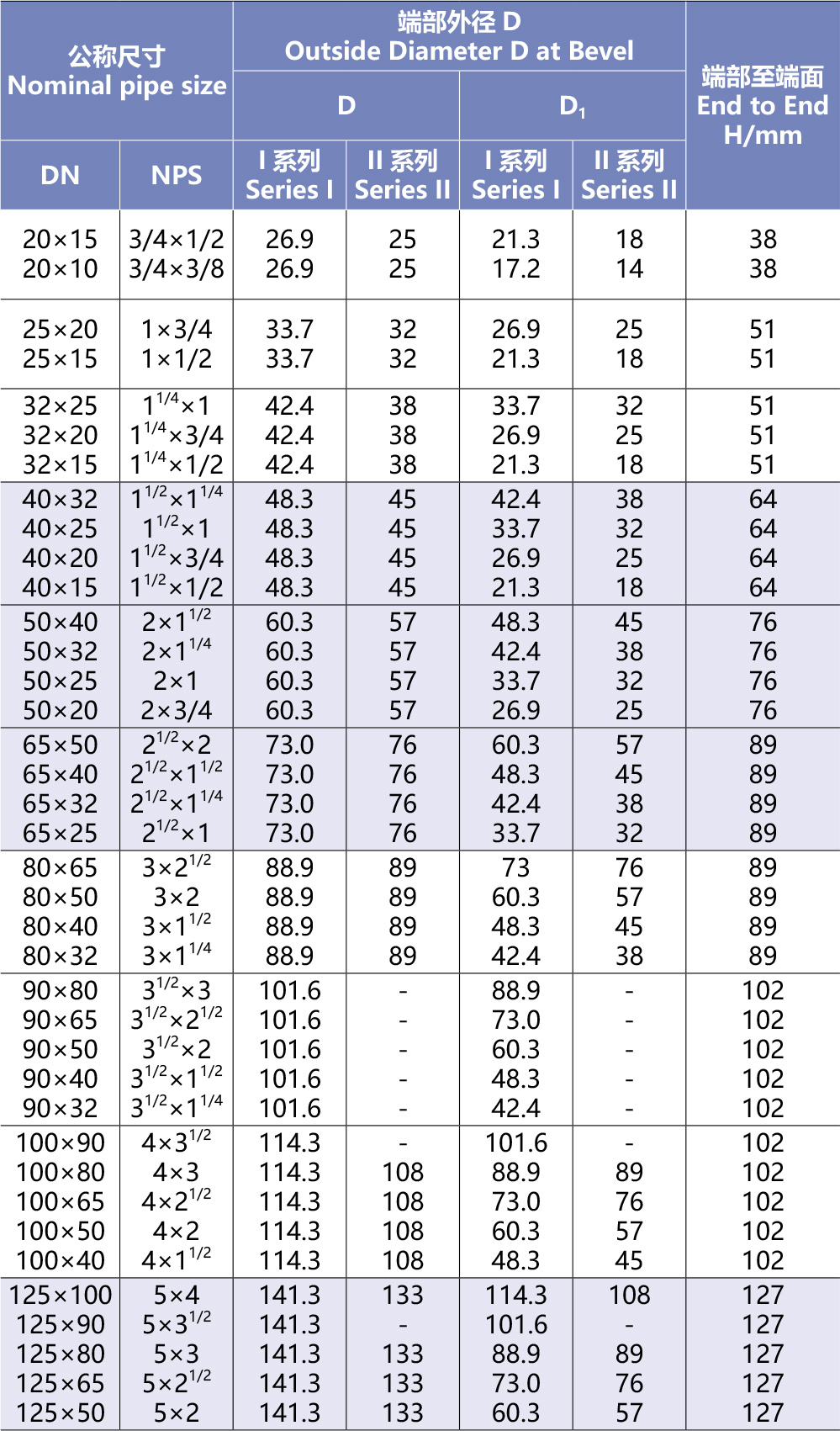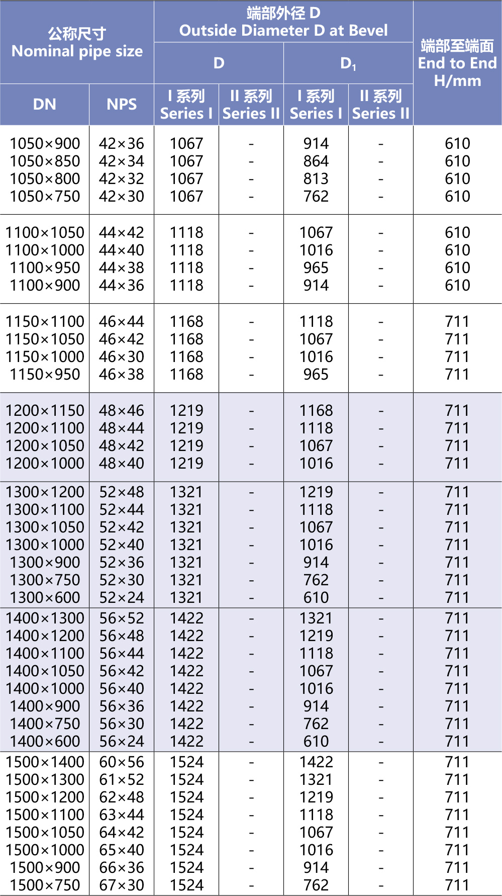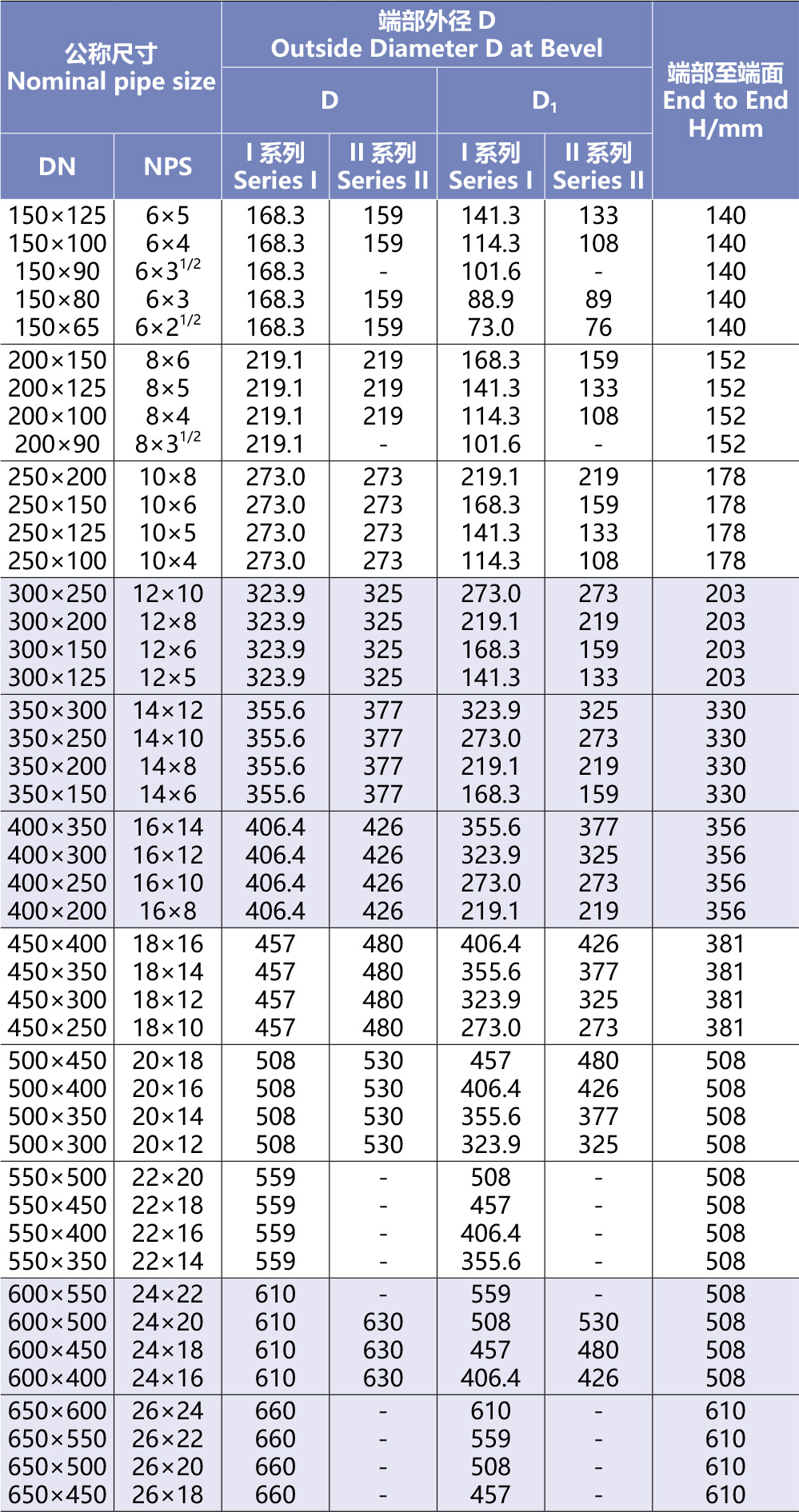 異徑管的質(zhì)量應(yīng)符合現(xiàn)行國家標(biāo)準(zhǔn)《鋼制對焊無縫管件》GB/T12459-2005及《鋼板制對焊管件》GB/T13401-2005的規(guī)定,異徑管的圓度不應(yīng)大于相應(yīng)端外徑的1%,且允許偏差為±3mm;異徑管尺寸允許偏差應(yīng)符合表4.2.2-3的規(guī)定。異徑管的材質(zhì)執(zhí)行SY/T5037、GB/T9711、GB/T8163、美標(biāo)ASTMA106/A53GRB,API5L、APT5CT、ASTMA105、ASTMA234、ASTMA106、DIN德國標(biāo)準(zhǔn)及客戶要求標(biāo)準(zhǔn)。